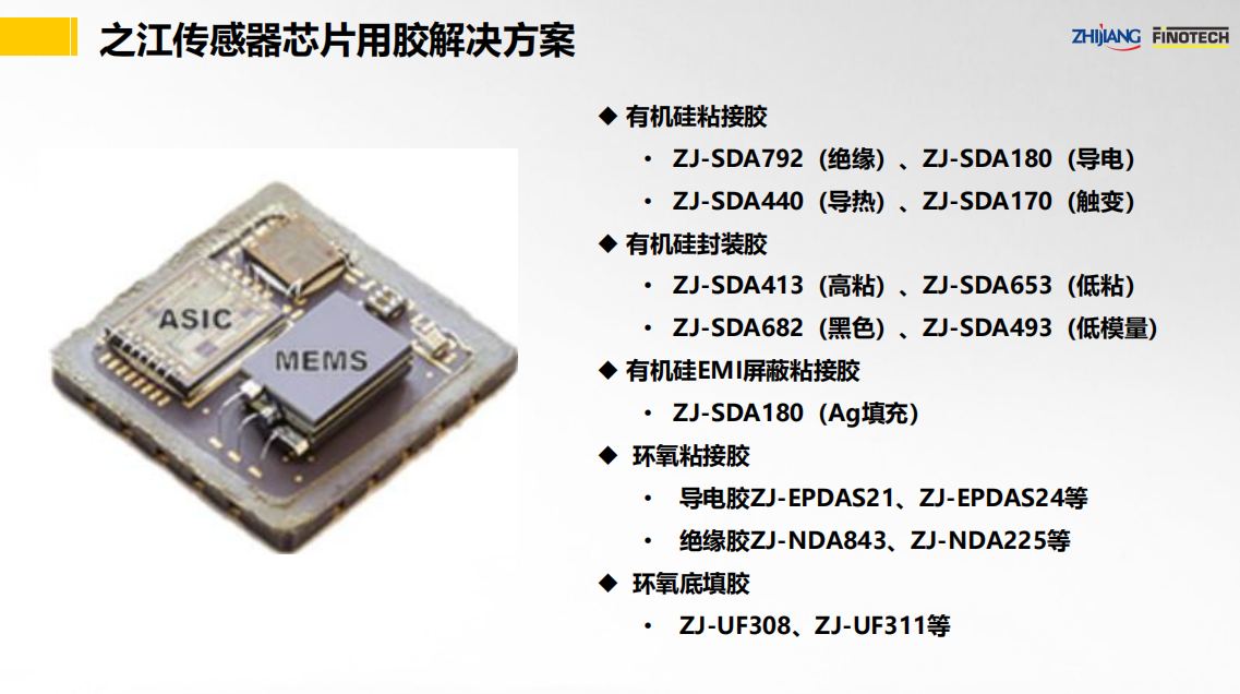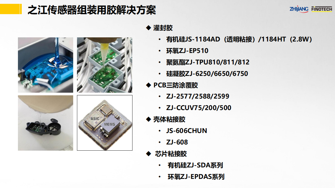 之江公司立足于中國膠粘劑行業(yè)領(lǐng)軍企業(yè)和有機硅、聚氨酯、環(huán)氧等專業(yè)膠粘劑的產(chǎn)業(yè)化優(yōu)勢,具有國家級高新技術(shù)企業(yè)和國家級企業(yè)技術(shù)中心資質(zhì),依靠國家級CNAS實驗室以及國家級博士后科研工作站,并有國際專家助力,為傳感器行業(yè)提供高性能的粘接密封解決方案。其中,關(guān)鍵產(chǎn)品如下: