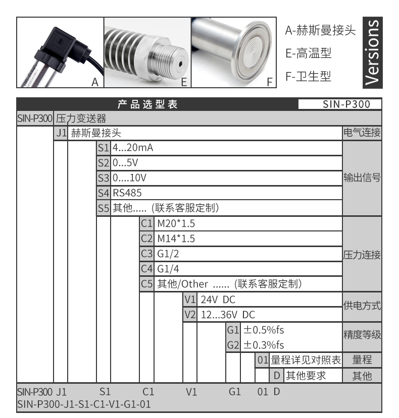 SIN-P300通用型壓力變送器德國進口硅芯片,精度高性能穩定;SIN-P300型通用型壓力變送器采用擴散硅壓力芯體作為敏感元件,內置處理電路將傳感器毫伏信號轉換成標準電壓﹑電流信號輸出,可直接與計算機、控制儀表﹑顯示儀表等相連。